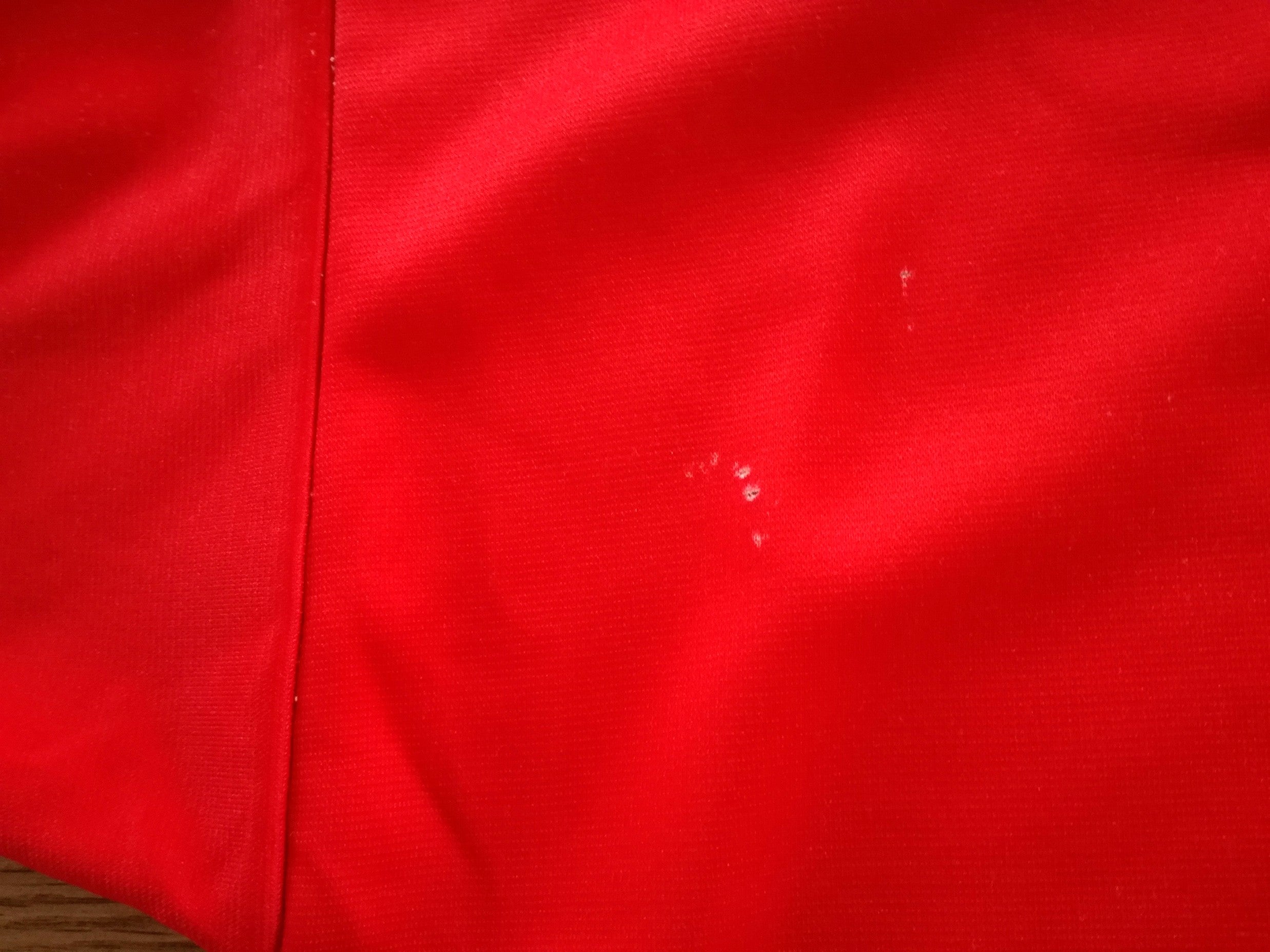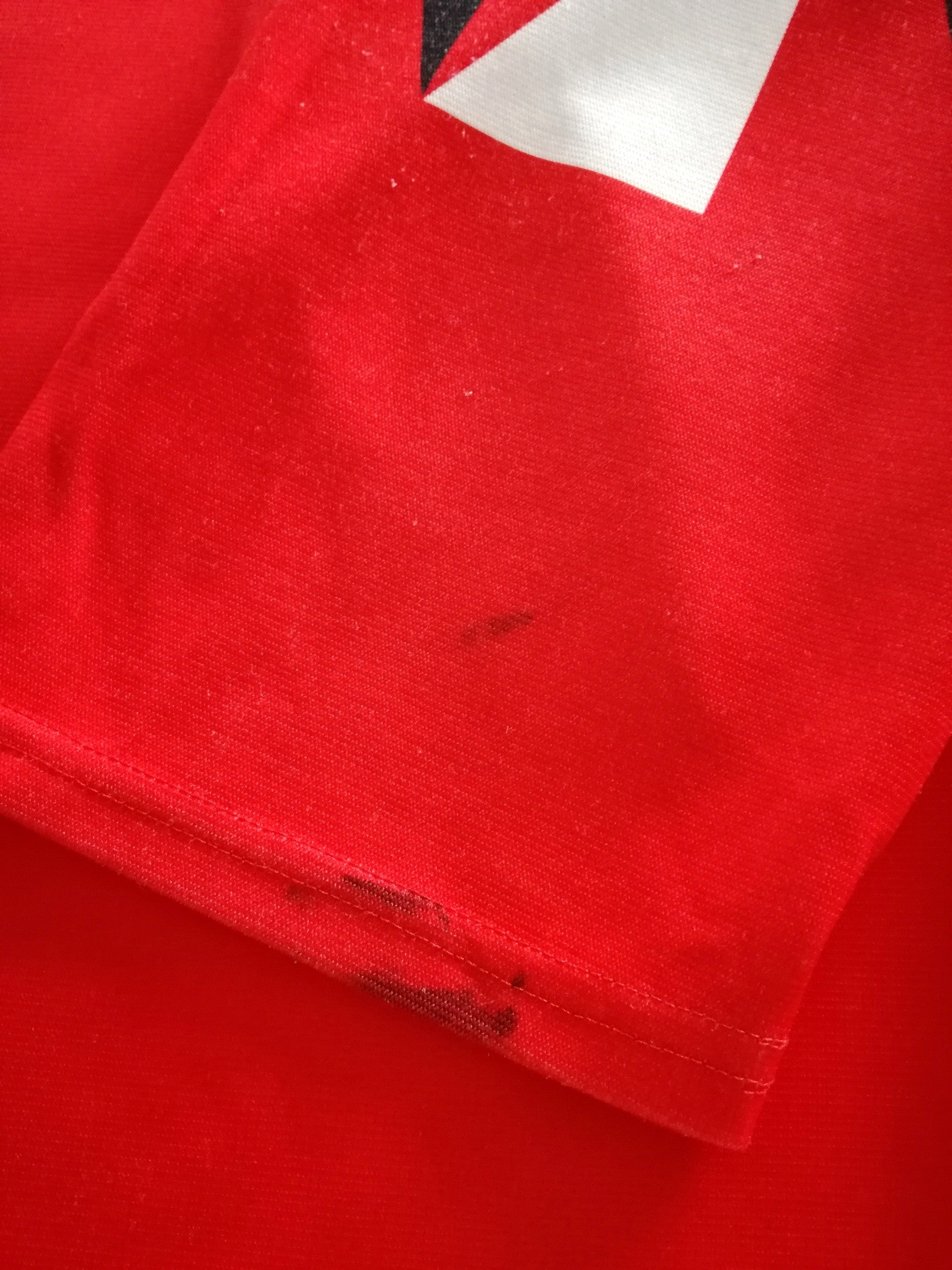 The condition of this original football jersey is 7/10 - Good. Some wear to the size label inside the collar. A personalised name on the label inside the collar. Some light surface wear & bobbles in places. A tiny pull on one sleeve. A few tiny holes on the rear near the sleeve. Some marks near the cuff of one sleeve (see photos).
