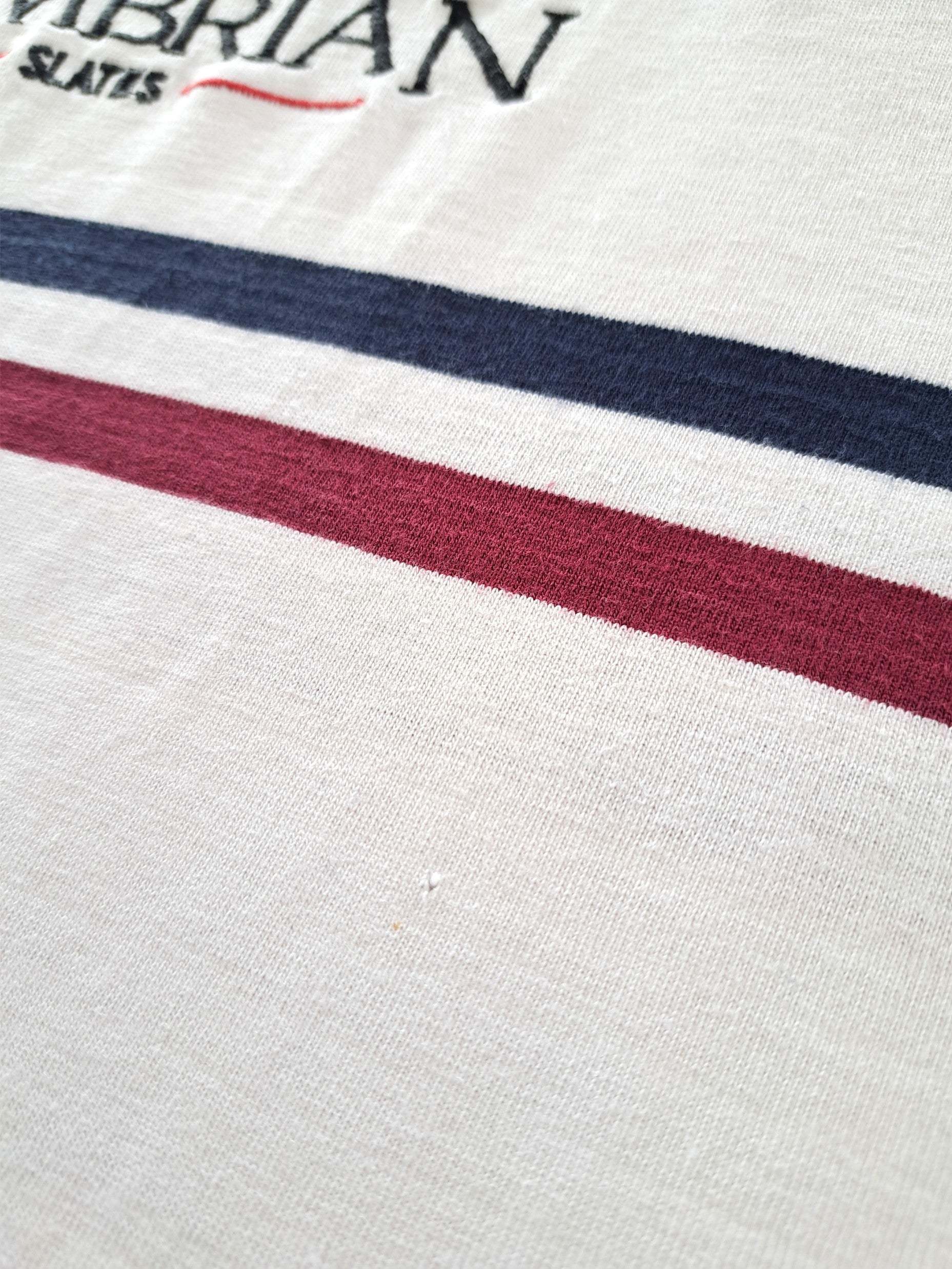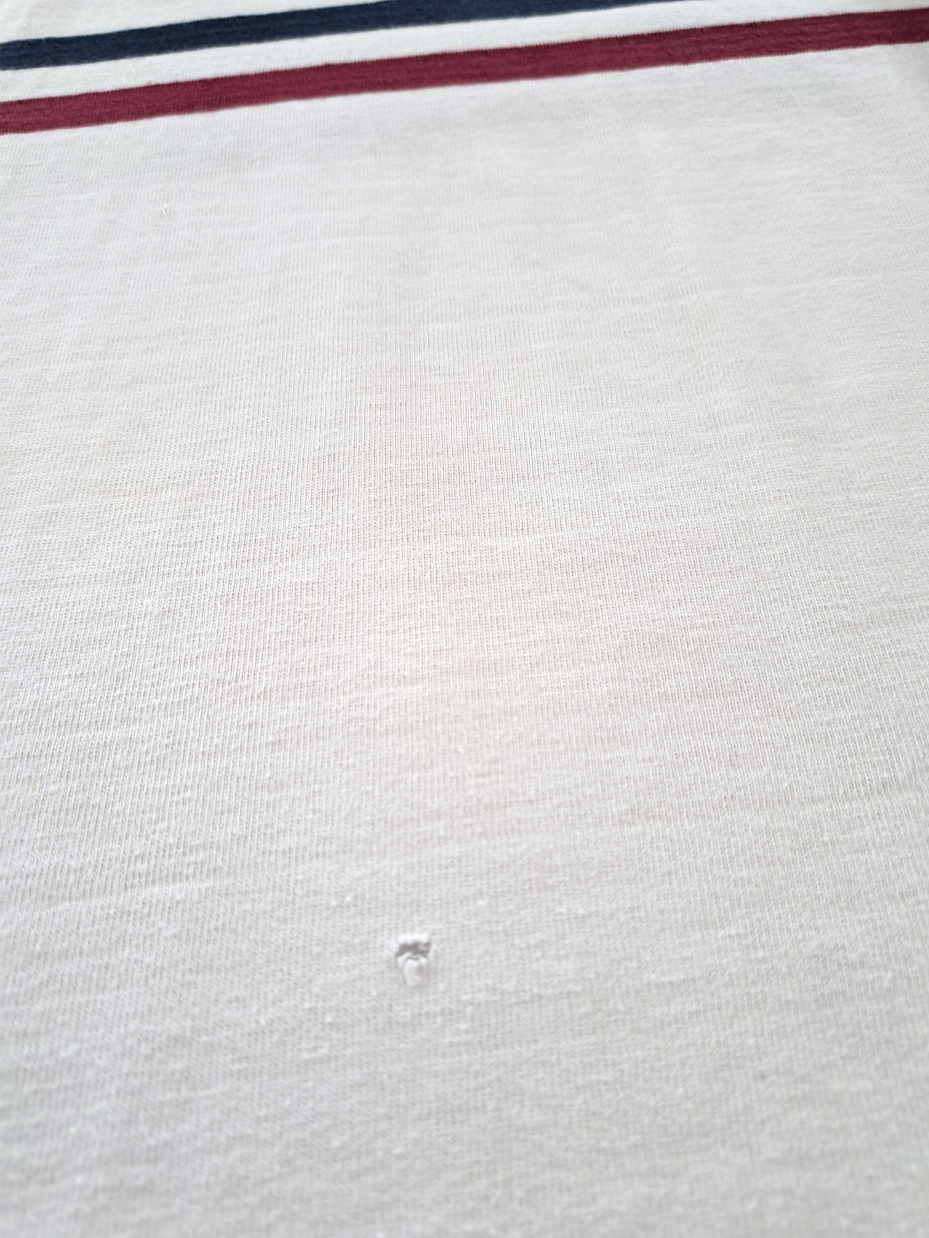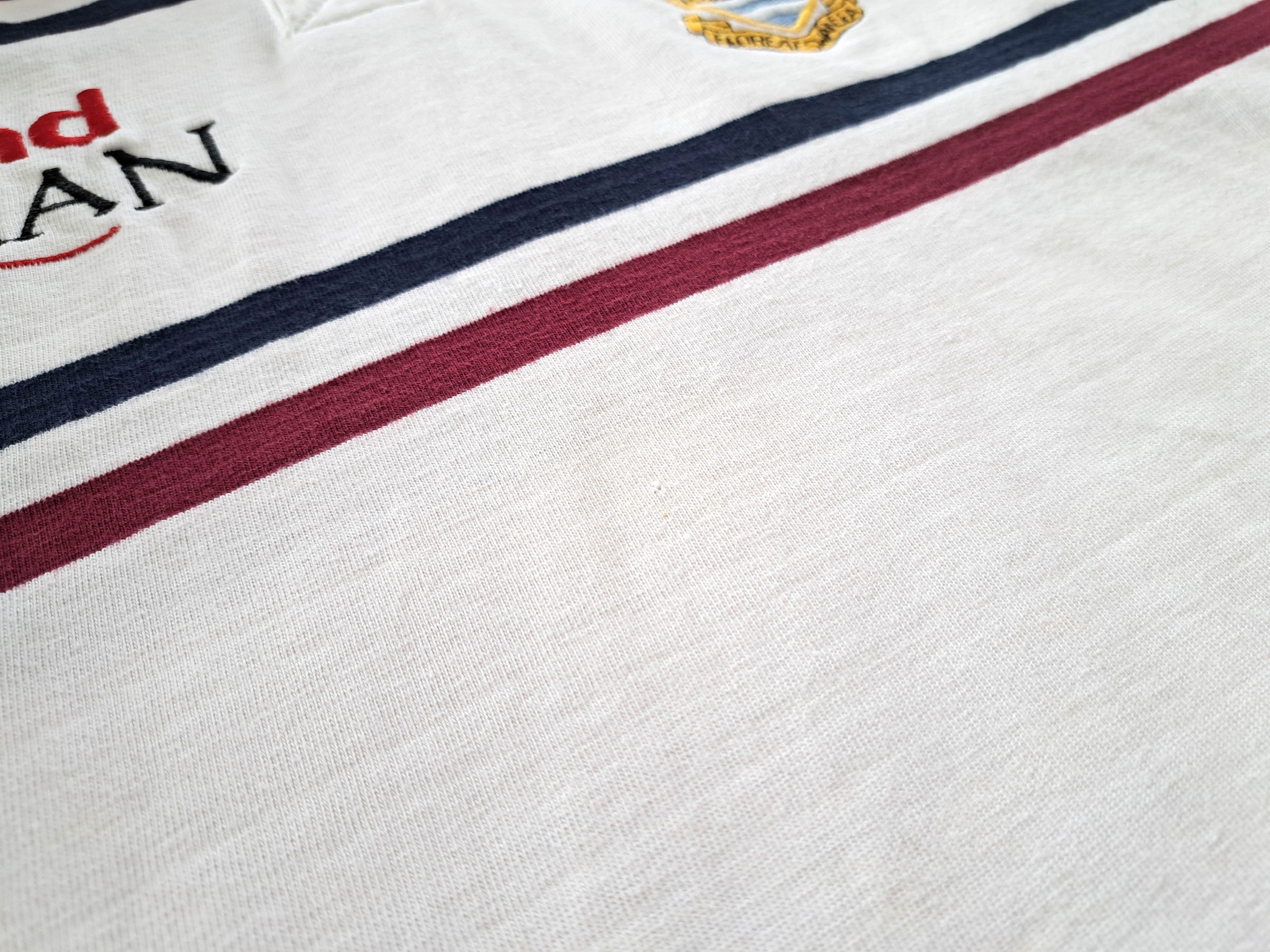 The condition of this vintage rugby jersey is 7/10 - Good. Light wear. A tiny hole on the chest, and a small hole on the lower front. A few small faint marks on the forearm of one sleeve (see photos).