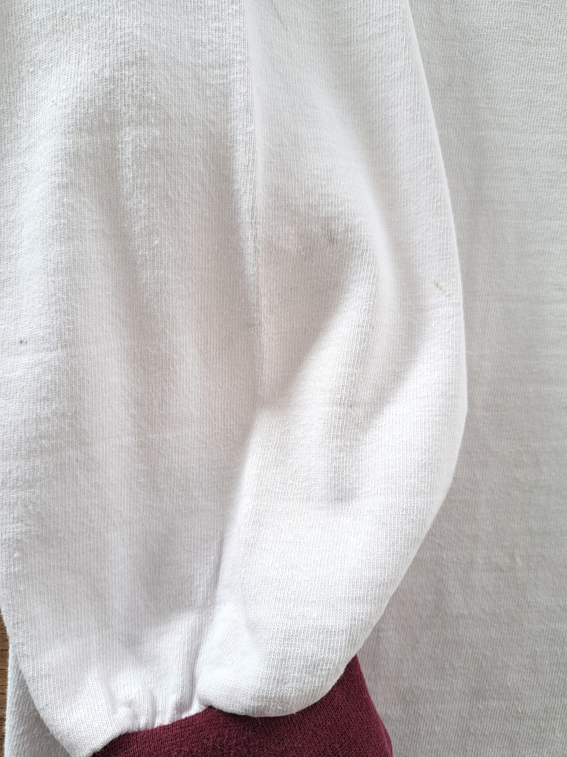 Condition: 7/10 Good. Light wear. A tiny hole on the chest, and a small hole on the lower front. A few small faint marks on the forearm of one sleeve