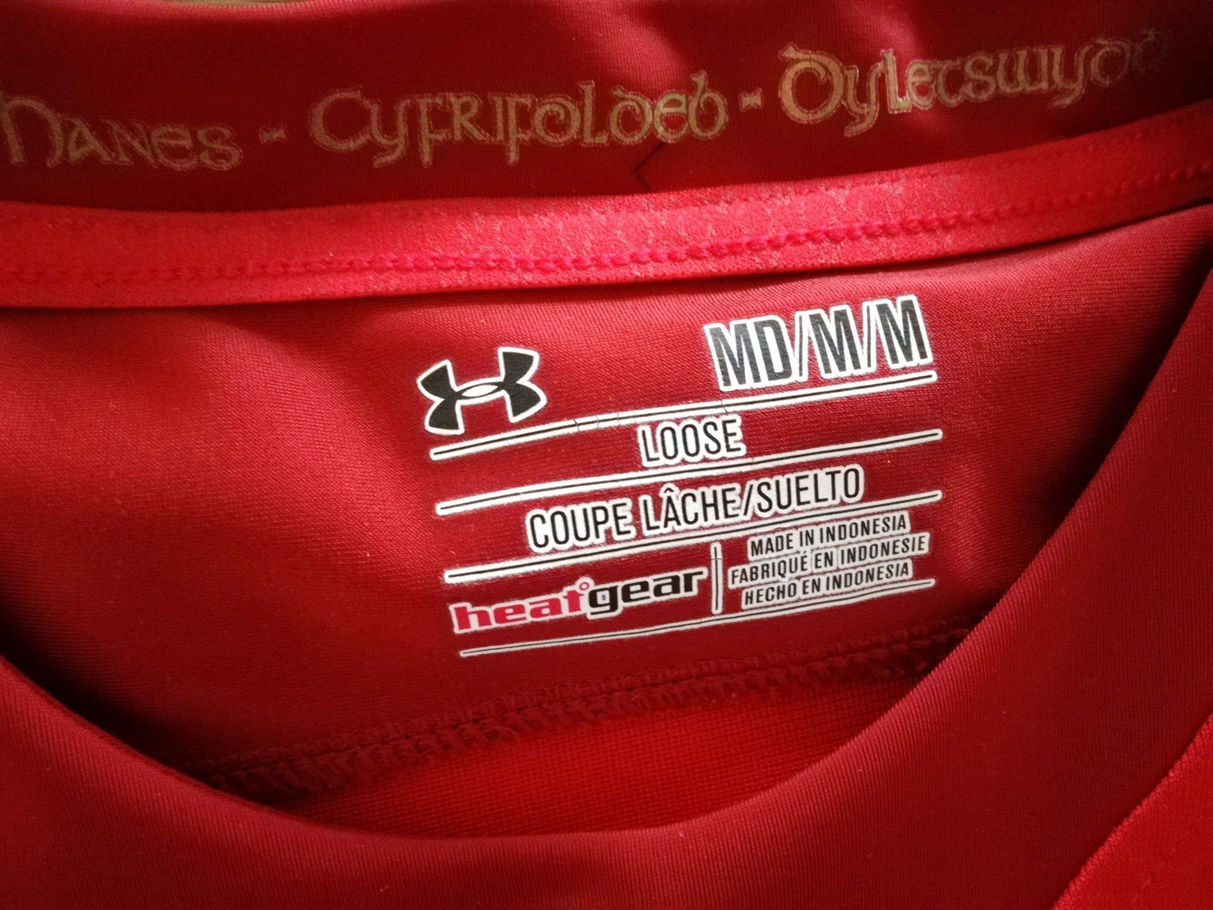 Official Under Armour Wales home rugby shirt from the 2015 international tournament. Complete with embroidered IRB 2015 Rugby World Cup patch on the chest and textured grip assist on the lower front (designed to aid ball control).